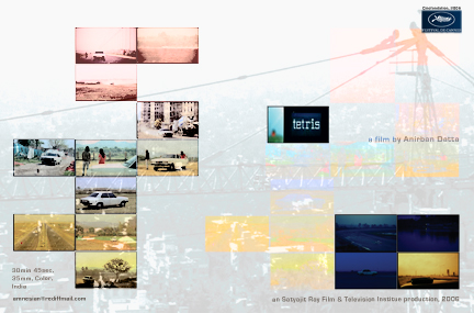 ‘Tetris’, 2006 a 30 mins short film, 35 mm Colour. The film writer, cameraman, production manager and the actress set off on a car trip driving through the story. A trip the director chooses to abstain. He believes it’s a story the road will write. All he needs is the writer to refine the route map… pen and petrol. A pointless long travel. The crewmembers fall apart one by one. Actress is let alone with the writer. The travel continues till they meet a dead end. But the story has to return.